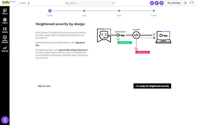 We back it up with permission-based support with end-to-end data encryption using government-approved 256-bit Advanced Encryption Standard (AES) and Secure Sockets Layer (SSL), multifactor authentication (MFA) to add a second level of security for your accounts to make credential attacks extremely difficult, and the ability to connect your business’s single sign-on (SSO) tool so agents can securely sign into GoTo Resolve with the same identity they use for other applications.